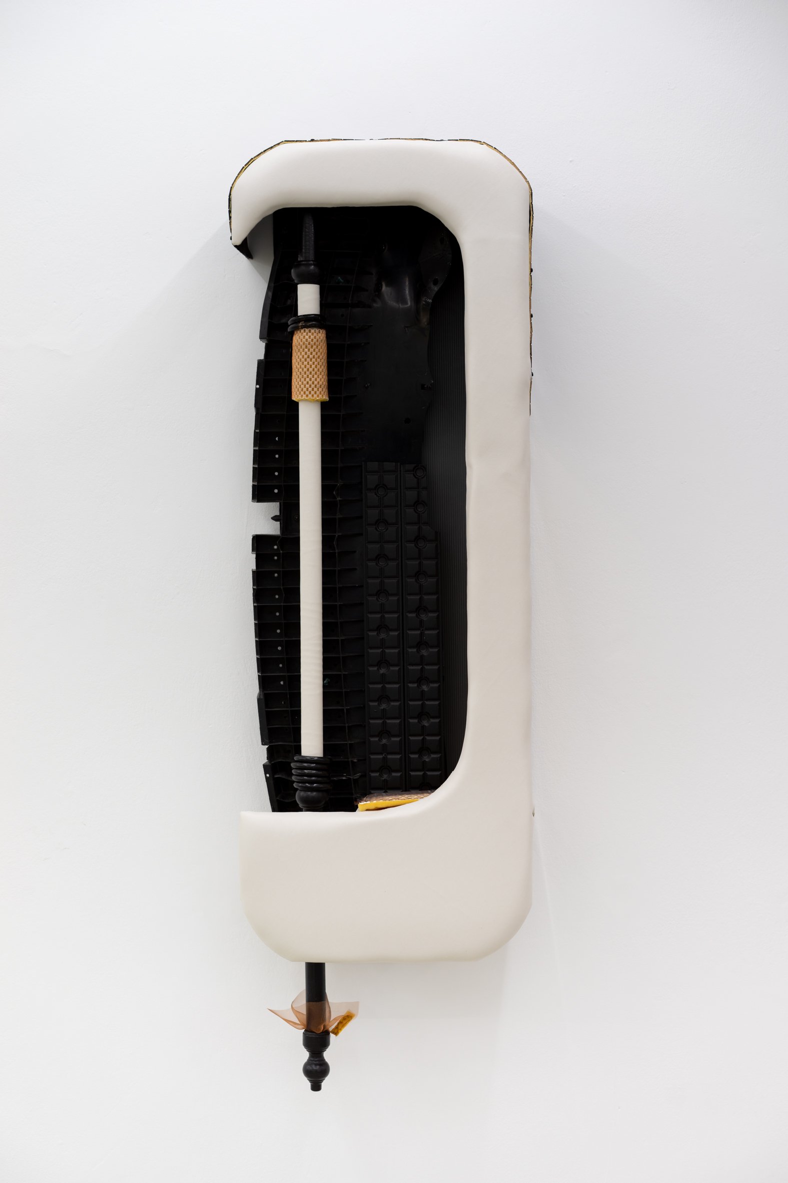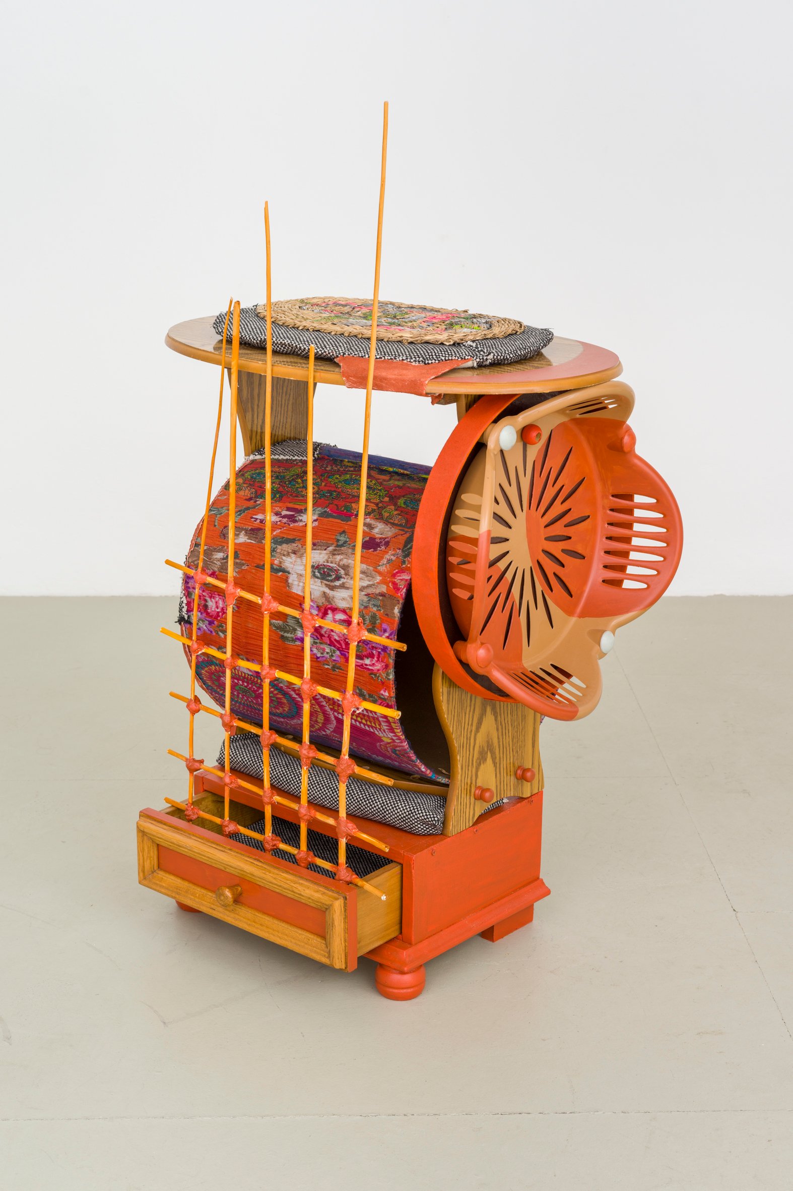 wood, upholstery nails, fabric, foam, raffia, acrylic paint