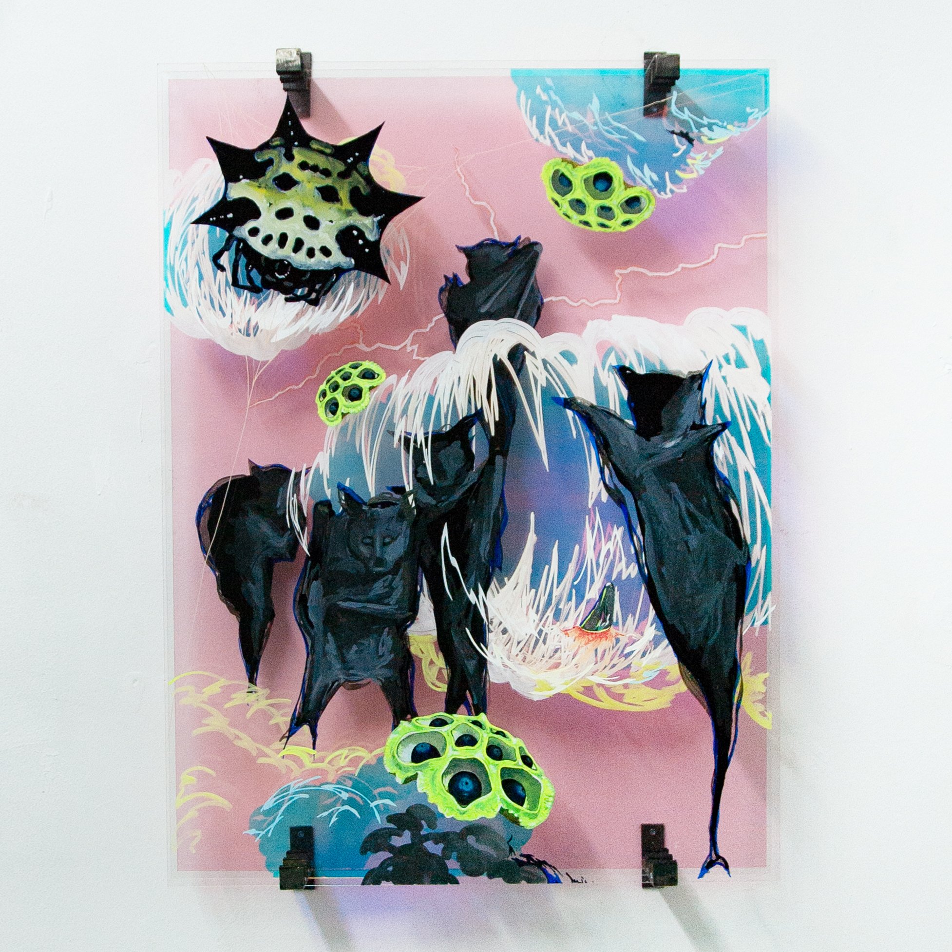 acrylic, ink and iridescent film on acrylic glass, steel