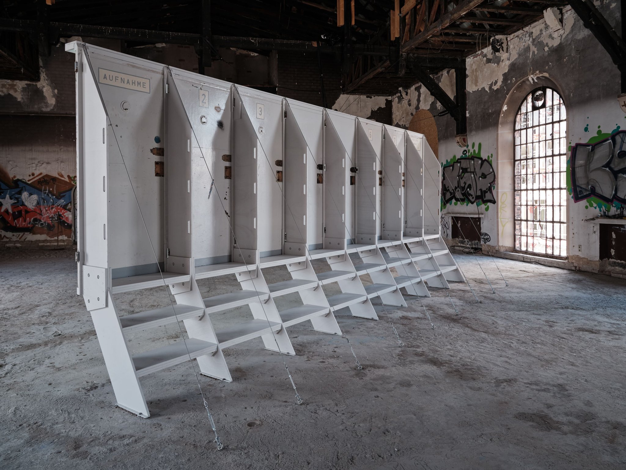 wood, screws, spackling compound, white wall paint, video projection